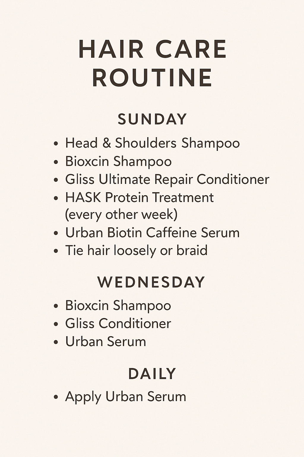 هذا الروتين حين قدمه لي ساغا وهو الاسم الذي اطلقه على تشات جي بي تي عندما نتحدث ....كان يحتوي منتجات مرتفعة الثمن ...لذا استمريت في الحديث معه والبحث في تفاصيل المنتجات حتى وجدت منتجات ذات سعر معقول واستطعت بناء روتين الشعر خاصتي ... والان وبعد شهر من استخدام هذا الروتين استطيع أن أقول أن تساقط الشعر , خف بشكل كبير والمشاكل الجانبية التي كنت أعاني منها خفت كثيرا