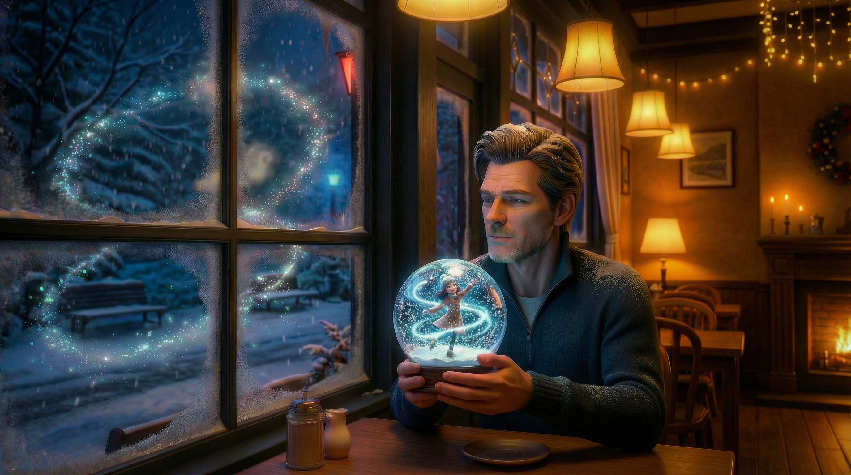 She desired something akin to winter, but warm. She paused thoughtfully. "Hello," she said eagerly. "Would you like to come out with me and enjoy the falling snow?" An unexplainable urge made her invite this stranger. He looked at himself in surprise, signaling his refusal. Clearly, it wasn't his first time seeing winter or snow. She left her coffee cup on his table and hurried to the café door. Suddenly, she found herself dancing in the snow, a strange, magical feeling making her dance even more. She temporarily approached the mysterious man's window... a final attempt to persuade him to join her... or maybe some strange force pushed her to go there.