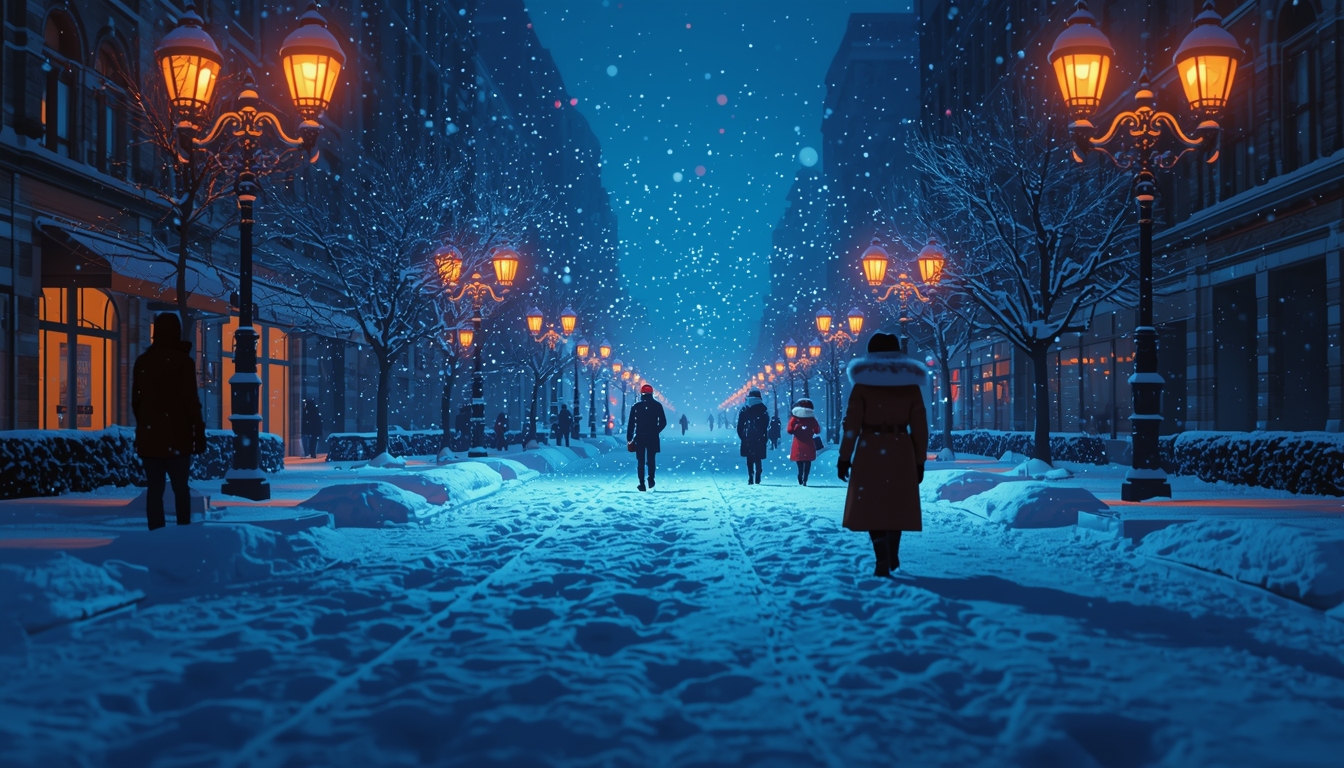 The cold city lights flickered inside her as she walked, briefly lost in her thoughts. She noticed a small café on a street corner, glowing with warm colors amid the snow. Its inviting appearance contrasted with the harsh winter, providing a comforting break from the biting cold.