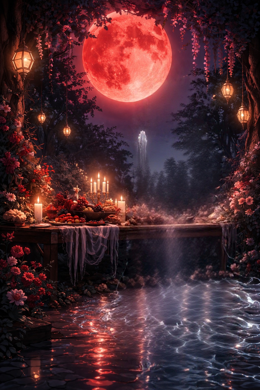 She prepared carefully. A grand feast stretched across her table—fruits split open, their colors spilling freely; breads, herbs, dark honey glistening like liquid night. She decorated her home with flowers and pieces of tree trunks, shaping something that resembled a celebration.
